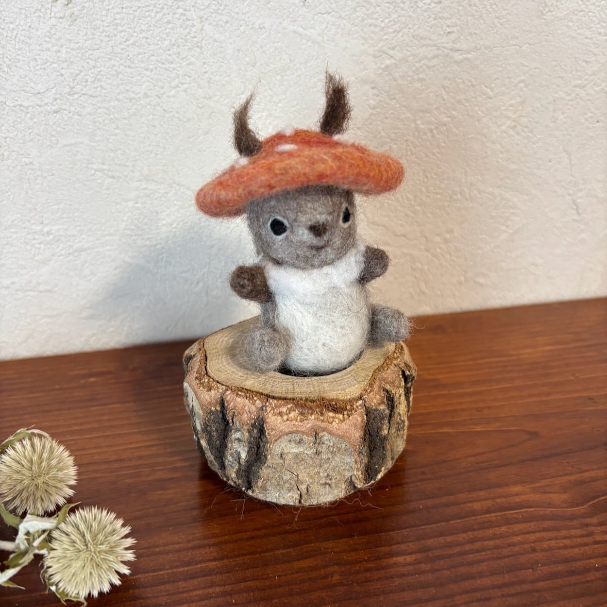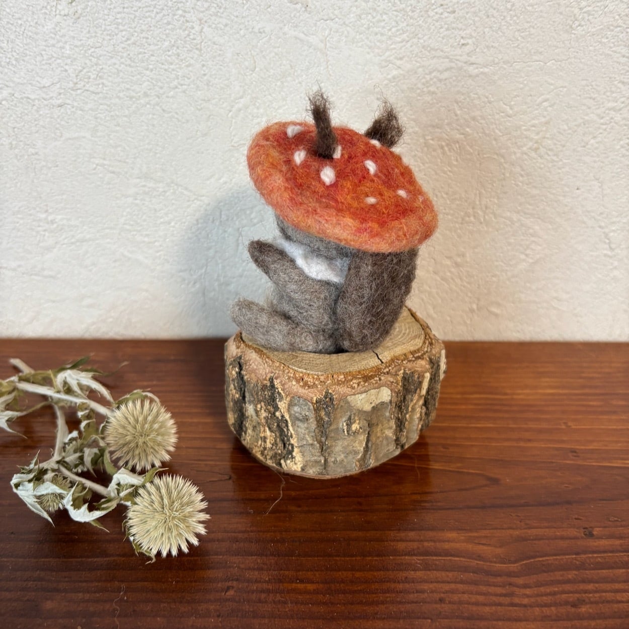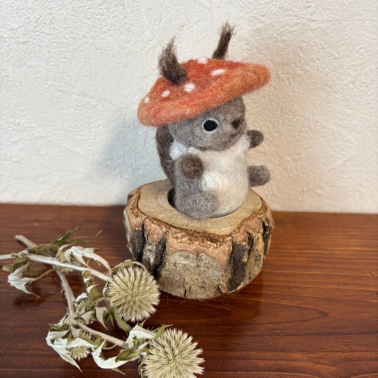 ちまちまっとしたエゾリスさんがキノコをかぶっちゃったフェルトのお飾りです^^