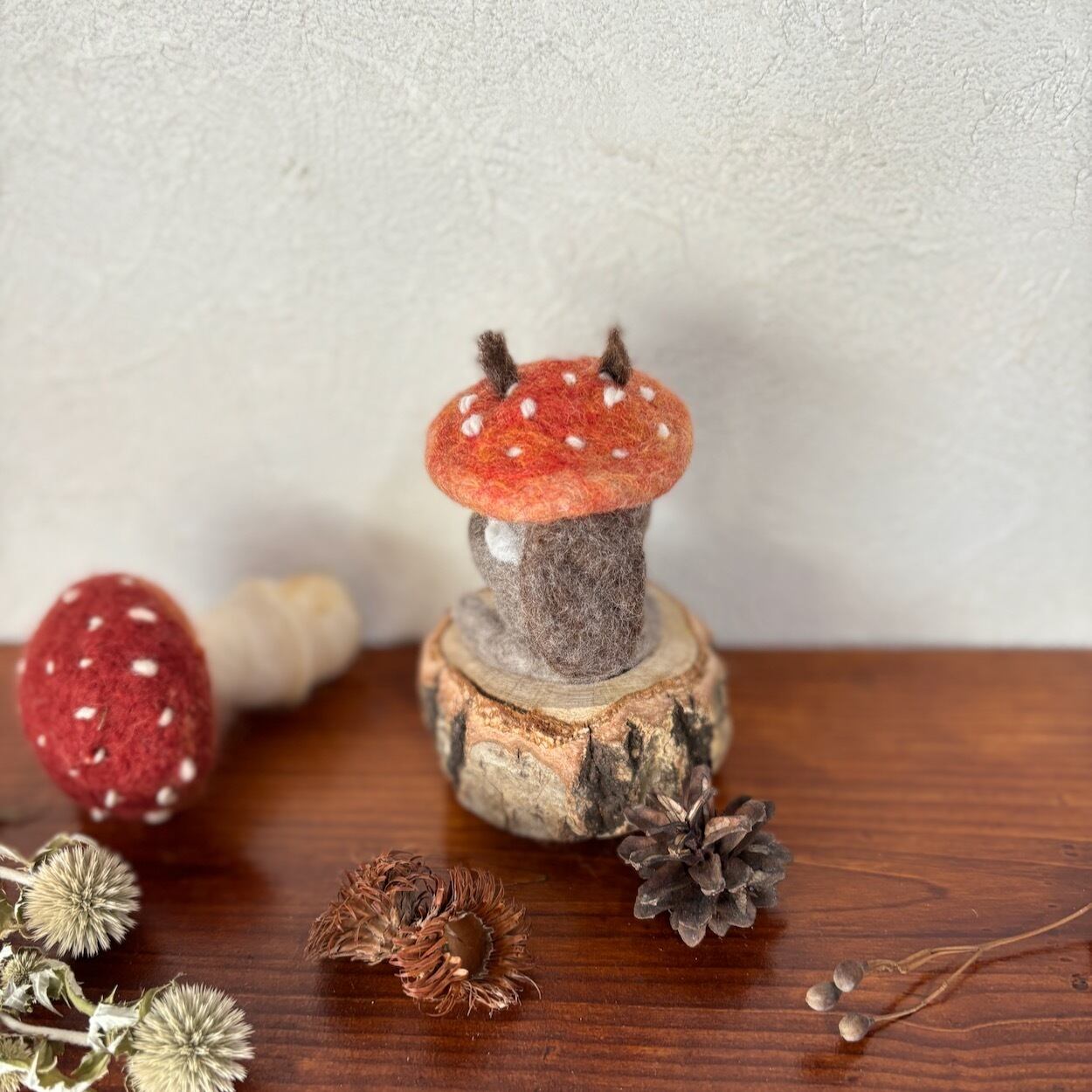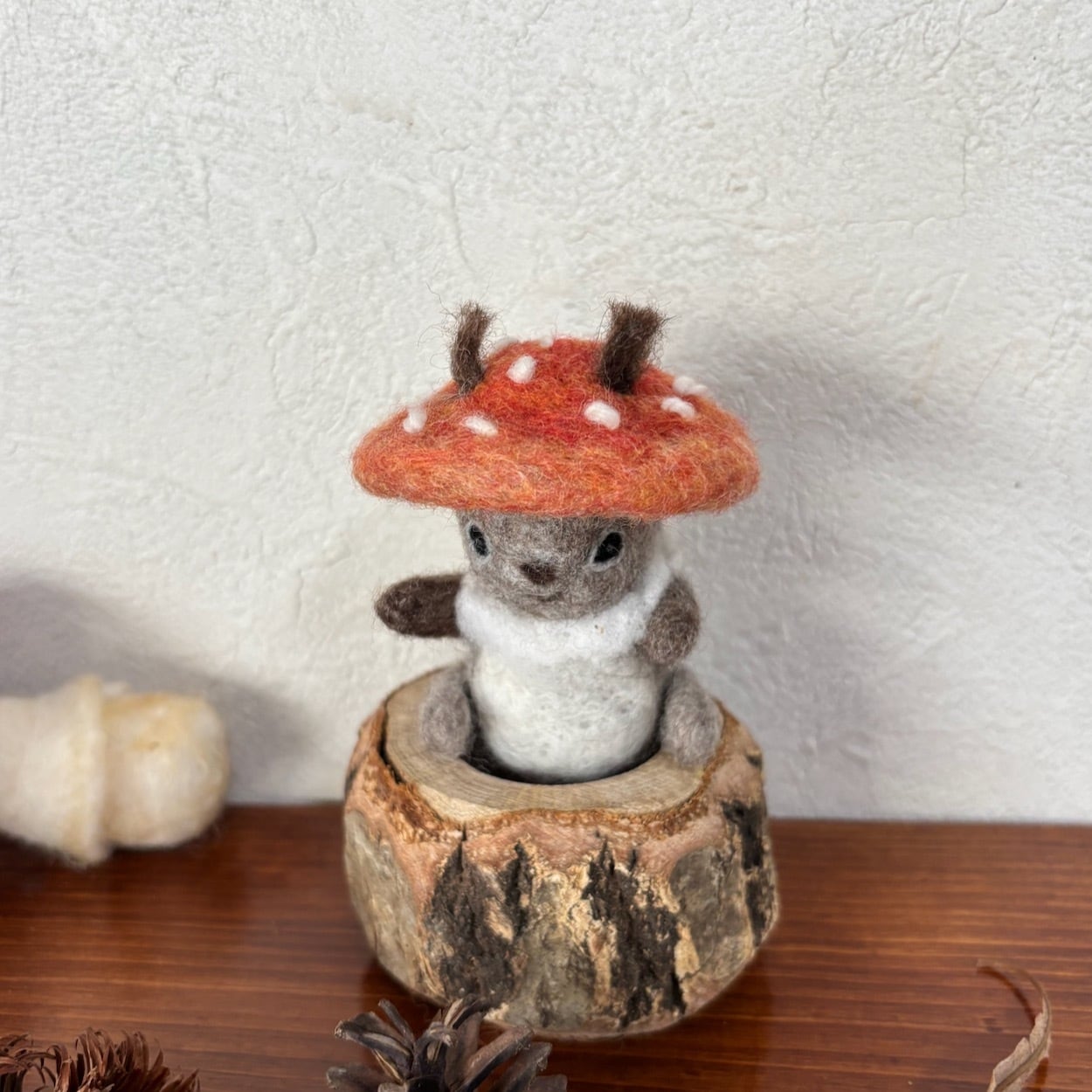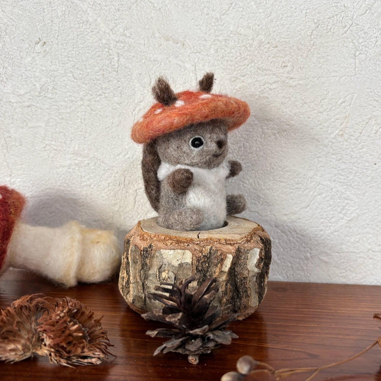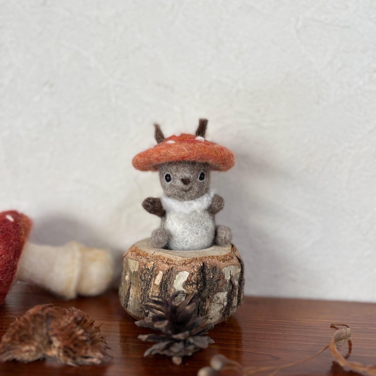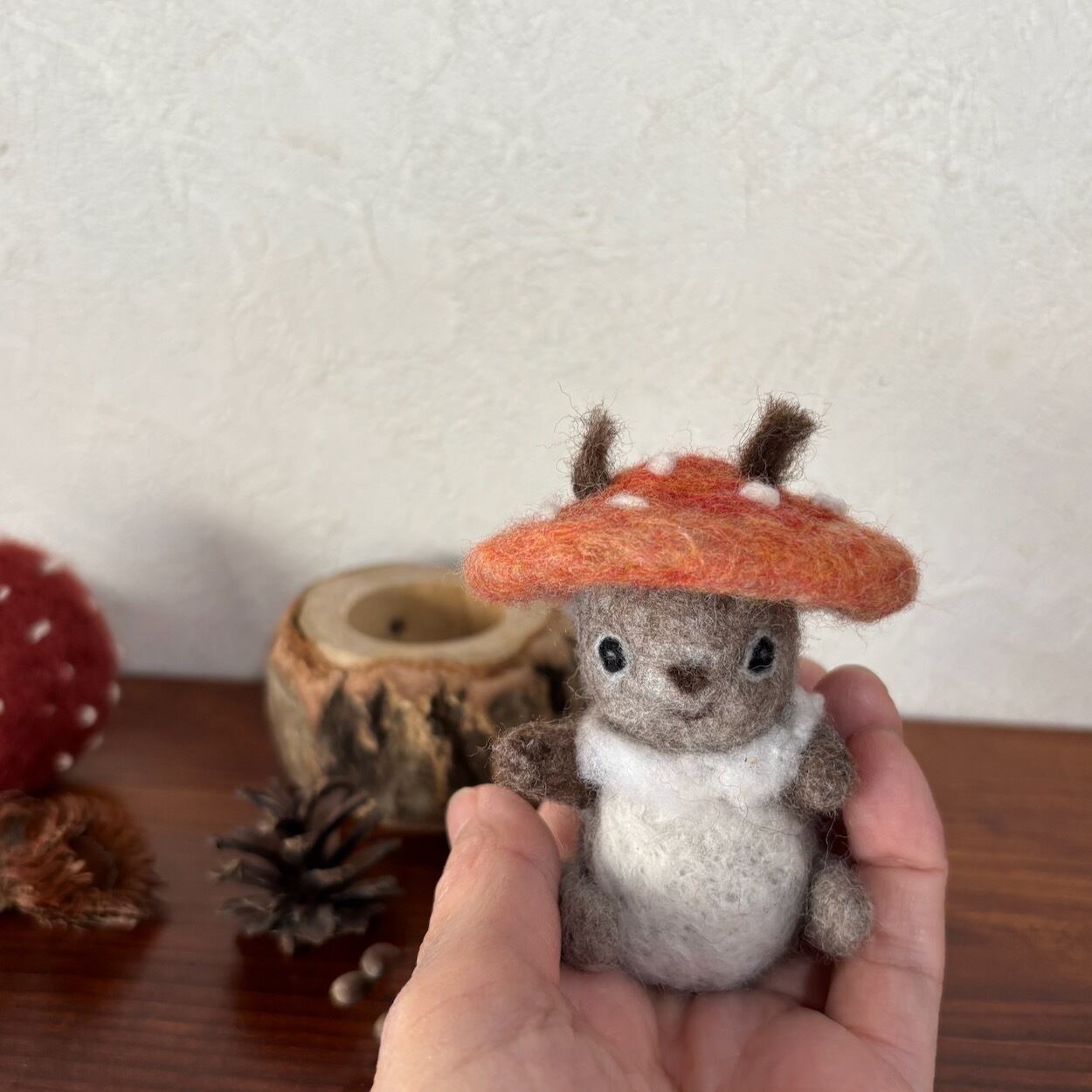 ちまちまっとしたエゾリスさんがキノコをかぶっちゃったフェルトのお飾りです